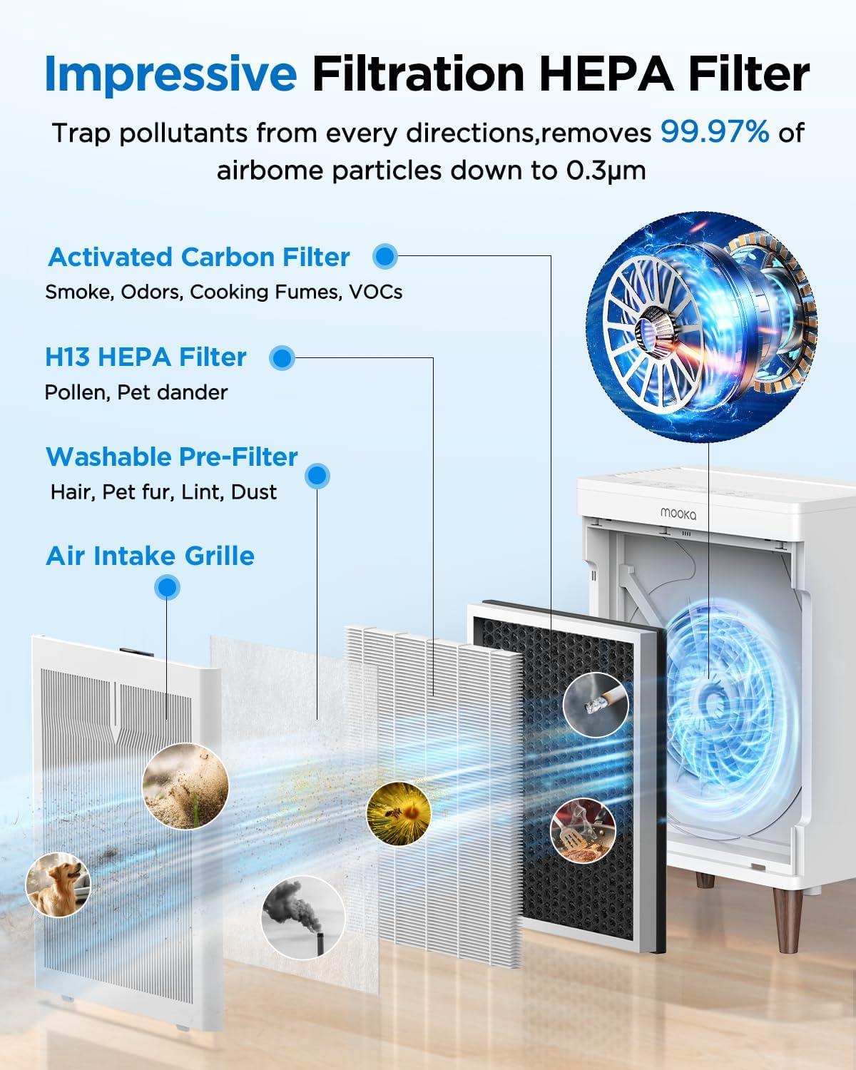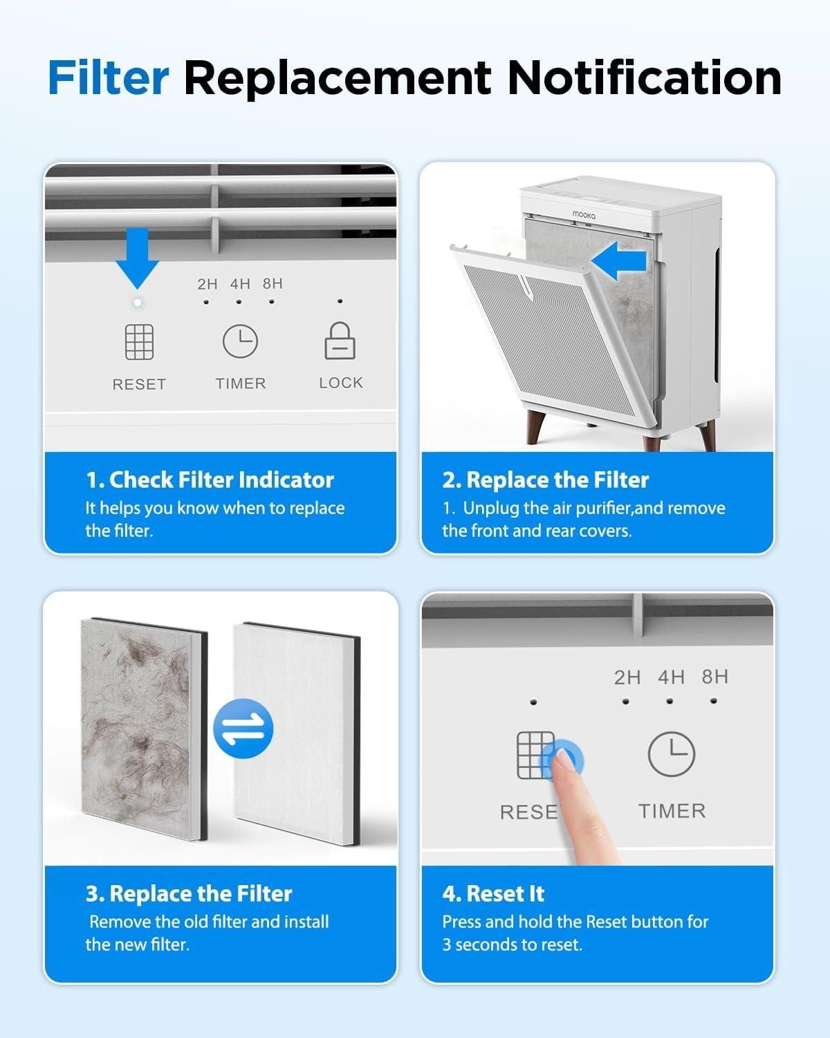 【Smart Filter Replacement Reminder】MOOKA HKB320F air purifier will remind you when it’s time to change the filter.We recommend replacing air filter every 6-8 months for best results.
