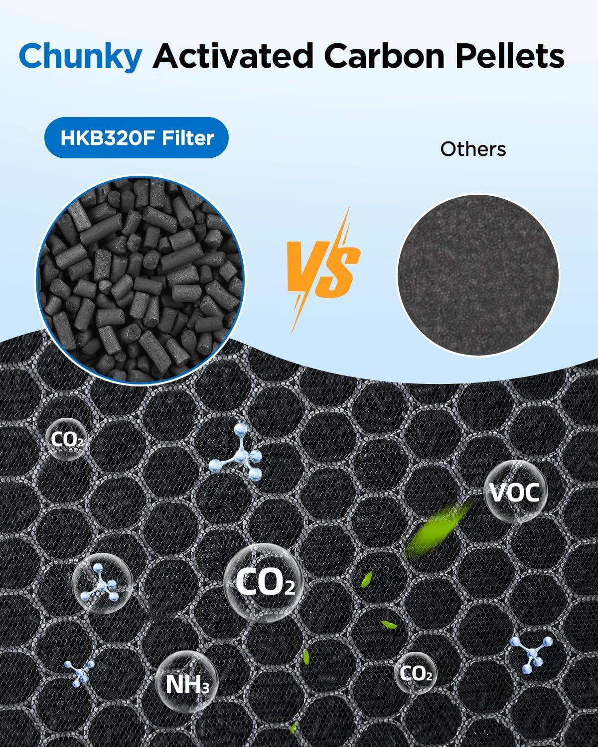 【3-Stage Filtration System】Our HKB320F filter replacement includes 3 filtration system,activated carbon filter with more pellets helps remove household odors, pet smells, smoke, VOCs, and other common pollutants for fresher.