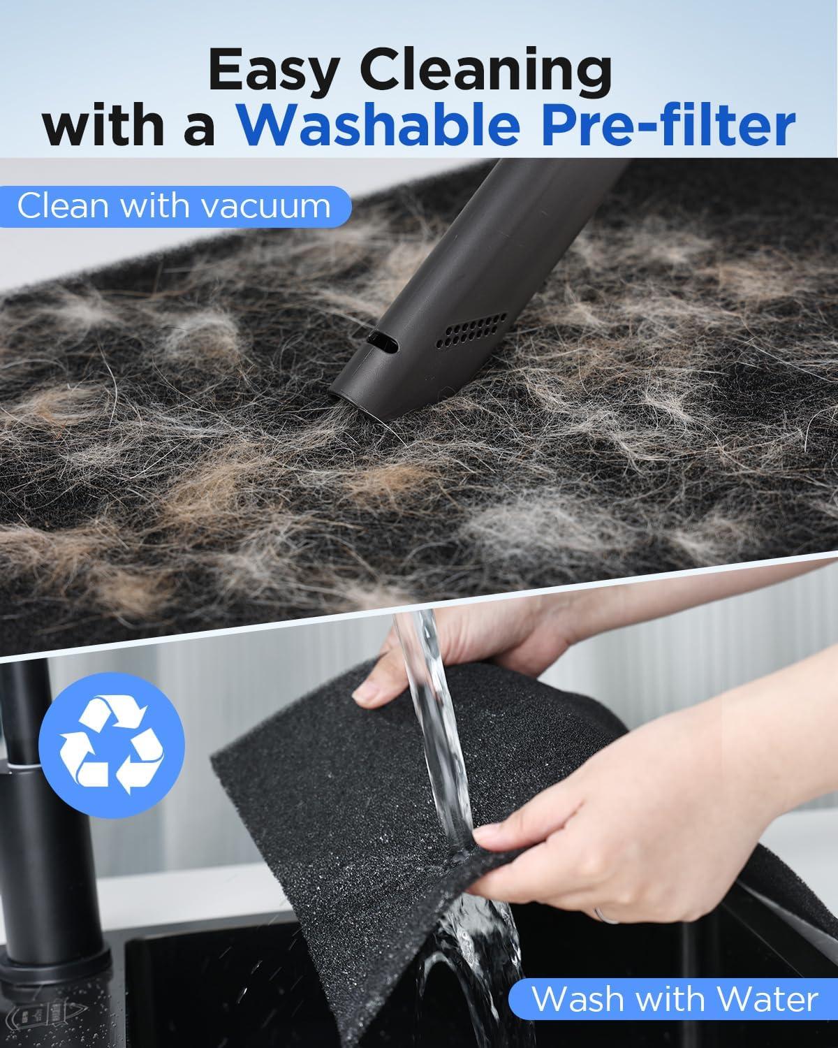POWERFUL FILTRATION & WASHABLE FILTER: Equipped with a high-efficiency 3-stage filtration system, the air cleaner for pets can effectively filter airborne particles as small as 0.3 microns, such as pollen, dust, and pet dander. Cleaning the pre-filter with water or a vacuum cleaner will help extend the life of the H13 HEPA filter.