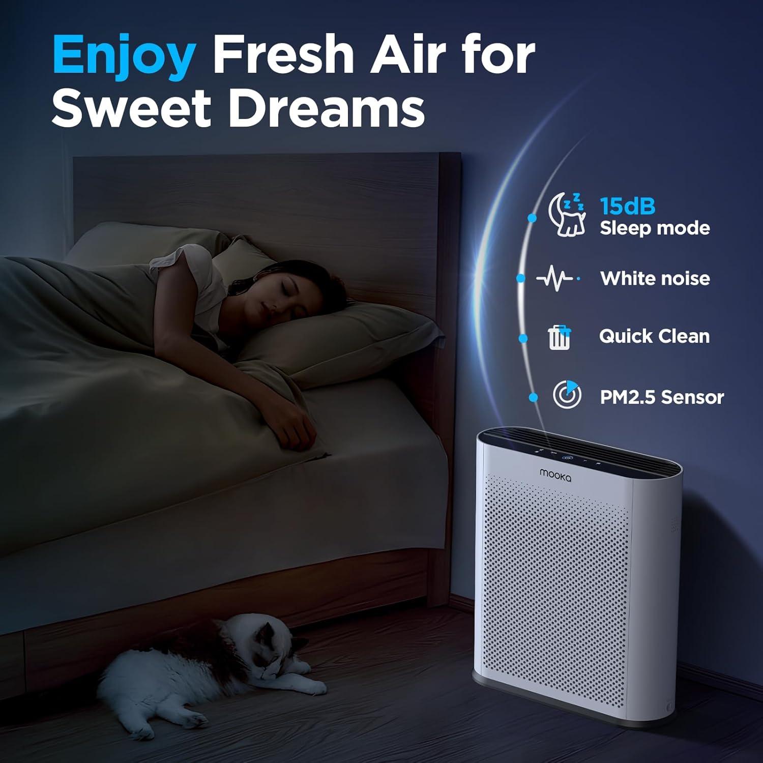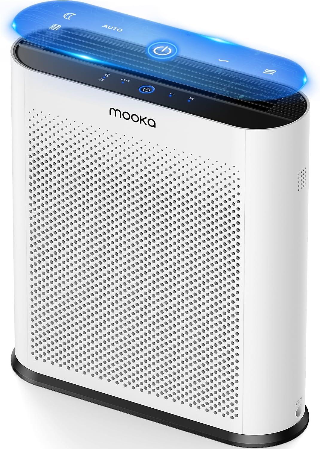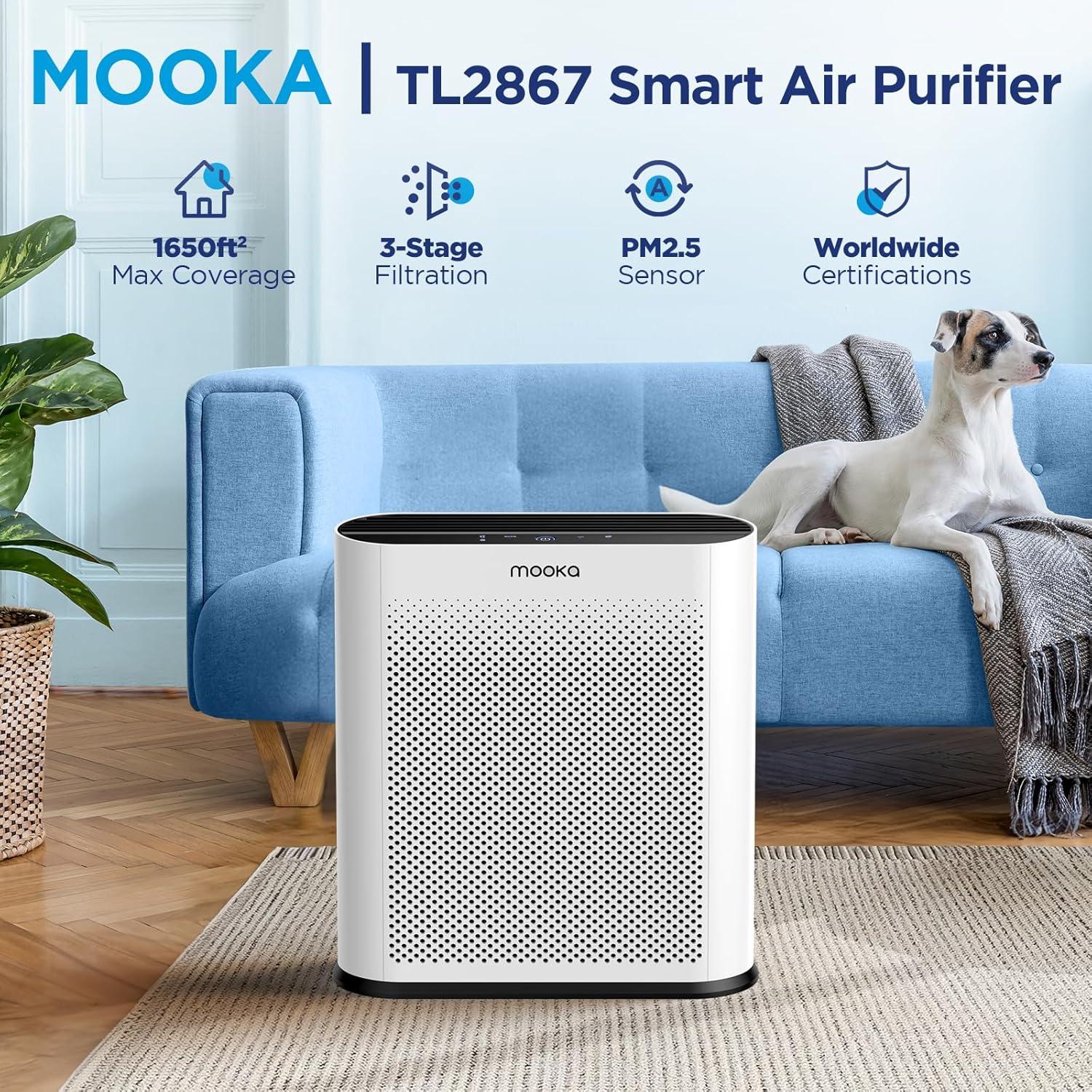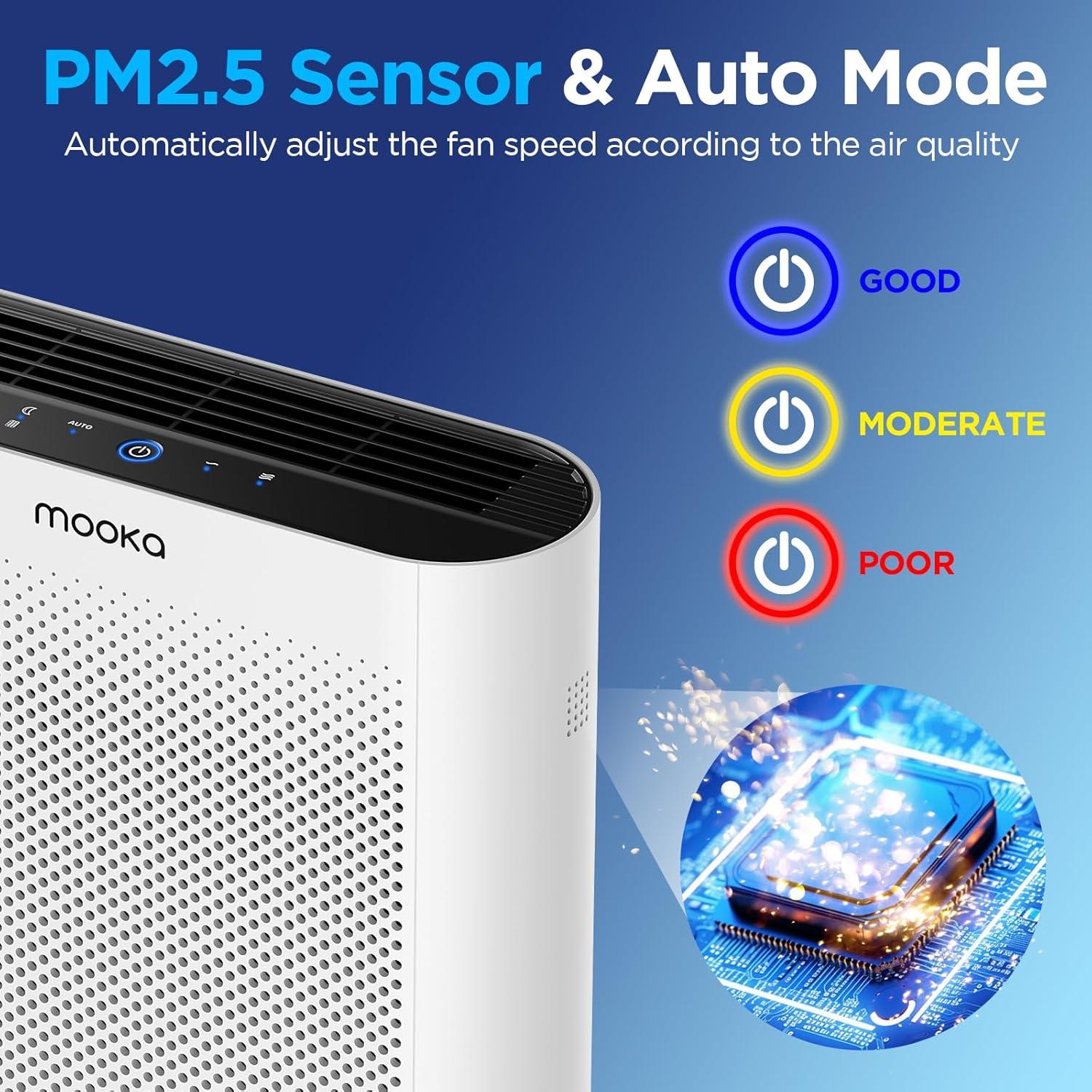 PM2.5 AIR QUALITY SENSOR: MOOKA TL2867 air purifier utilizes the latest dust sensing technology with a built-in chip that detects the real-time air quality in the house. In auto mode, it will automatically adjust the fan speed according to the air quality of the room.
