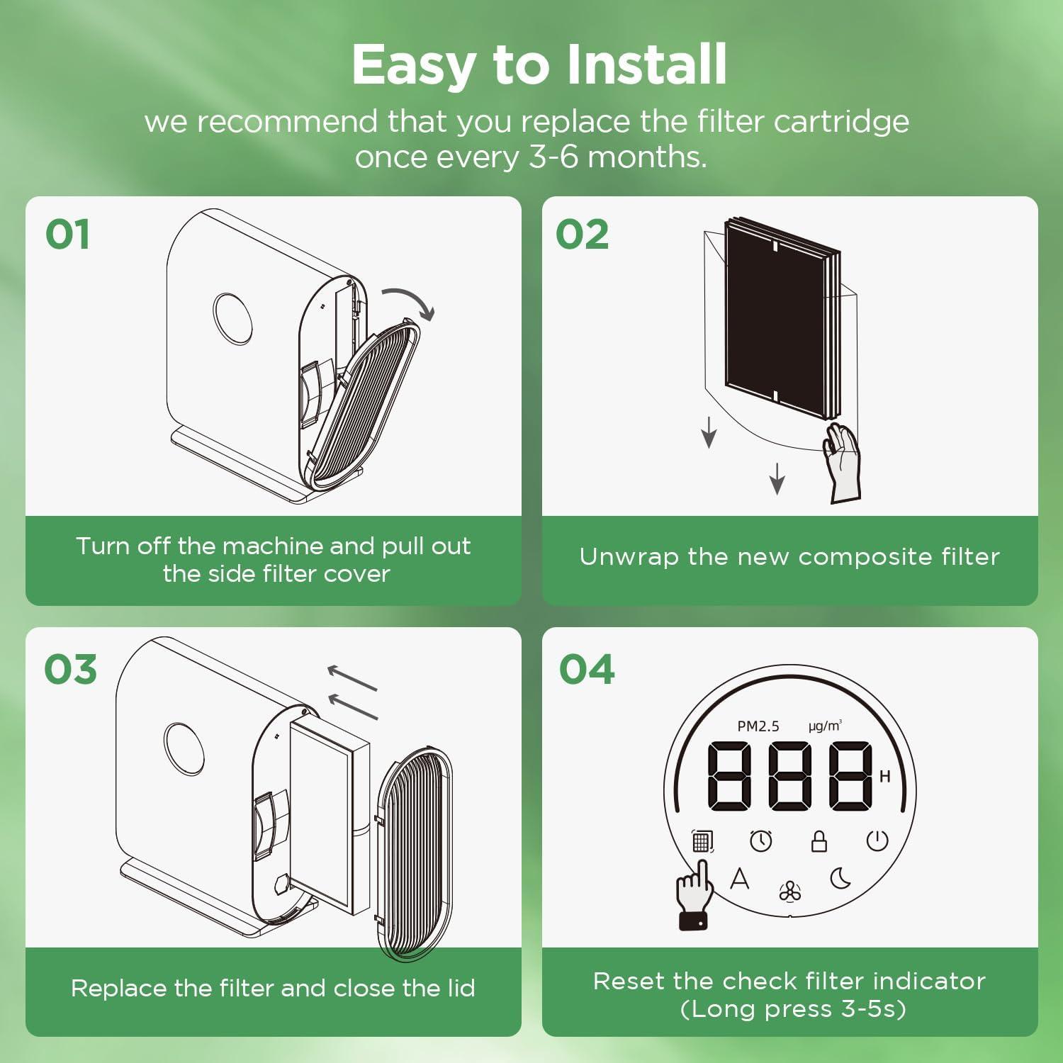Easy to Install and Use: Installing our replacement filter is quick and straightforward. Simply follow the included instructions and you'll have your air purifier back to its peak performance in no time. No tools or special skills required.